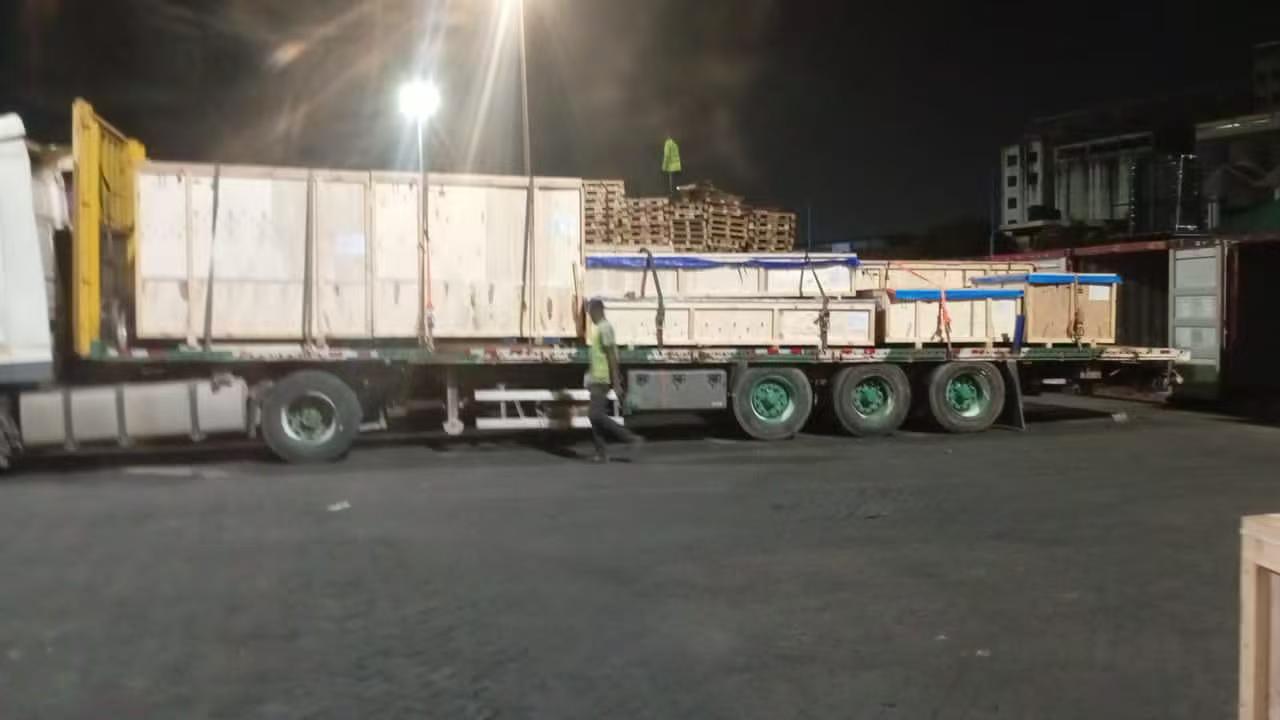 Sa pagdating ng mga kalakal sa Tema Port, Ghana, ang aming nakumpleto ng propesyonal na koponan ang pagtanggap at inspeksyon kaagad. Para sa malaking kapangyarihan kagamitan, nagsagawa kami ng buong prosesong paghagupit at pagpapalakas para maiwasan displacement sa panahon ng transportasyon sa lupa. Ang lahat ng mga kalakal ay ganap na sakop waterproof laminated tarpaulin para labanan ang malupit na panahon at pagkasira ng kahalumigmigan. Ang bawat sasakyang pang-transportasyon ay nilagyan ng karaniwang form ng resibo para sa buong-prosesong traceability at verification.